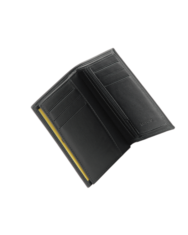 - Un portefeuille à la française : 10 x 12,5 x 2 cm composé de trois volets, six emplacements carte, une poche plaquée zippée, quatre emplacements multifonctions, et deux parois plastifiées.